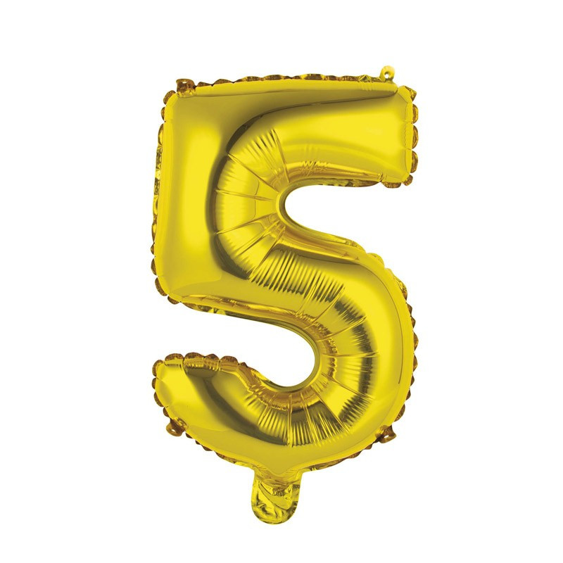 Levegővel fújható 5-ös arany szám fólia lufi. A csomag tartalmazza a fújáshoz a pálcát.