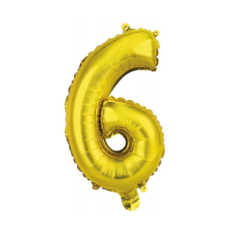 Levegővel fújható 6-os arany szám fólia lufi. A csomag tartalmazza a fújáshoz a pálcát.