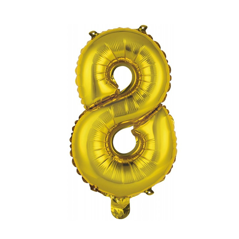 Levegővel fújható 8-as arany szám fólia lufi. A csomag tartalmazza a fújáshoz a pálcát.