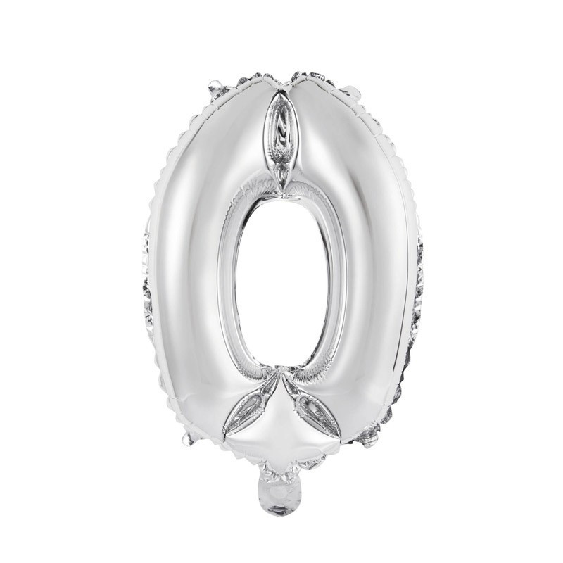 Levegővel fújható 0-ás ezüst szám fólia lufi. A csomag tartalmazza a fújáshoz a pálcát.