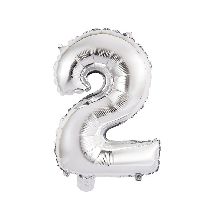 Levegővel fújható 2-es ezüst szám fólia lufi. A csomag tartalmazza a fújáshoz a pálcát.