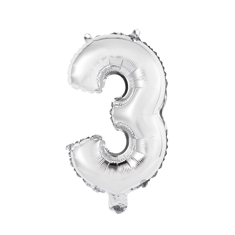 Levegővel fújható 3-as ezüst szám fólia lufi. A csomag tartalmazza a fújáshoz a pálcát.
