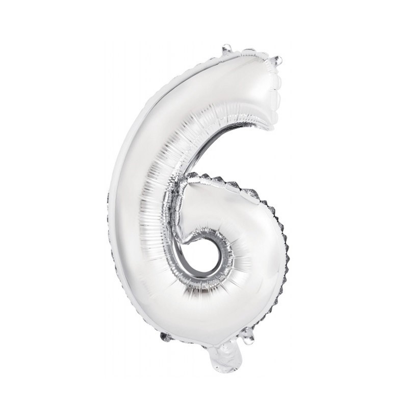 Levegővel fújható 6-os ezüst szám fólia lufi. A csomag tartalmazza a fújáshoz a pálcát.