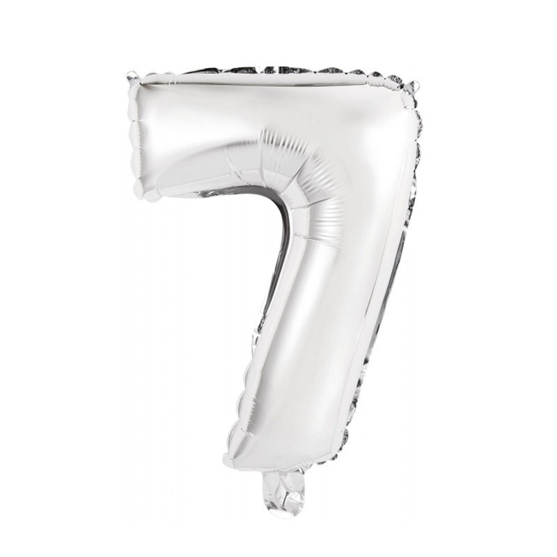Levegővel fújható 7-es ezüst szám fólia lufi. A csomag tartalmazza a fújáshoz a pálcát.