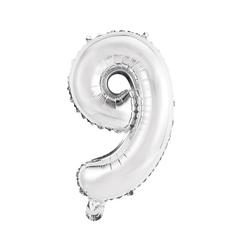 Levegővel fújható 9-es ezüst szám fólia lufi. A csomag tartalmazza a fújáshoz a pálcát.