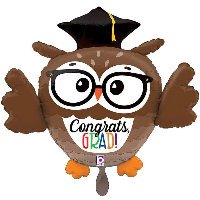 Bagoly alakú ballagási fólia lufi Congrats Grad! felirattal.