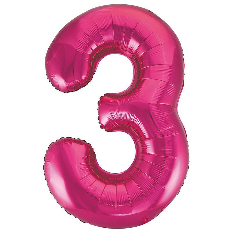 86 cm magas 3-as, rózsaszín színű nagy szám fólia lufi.