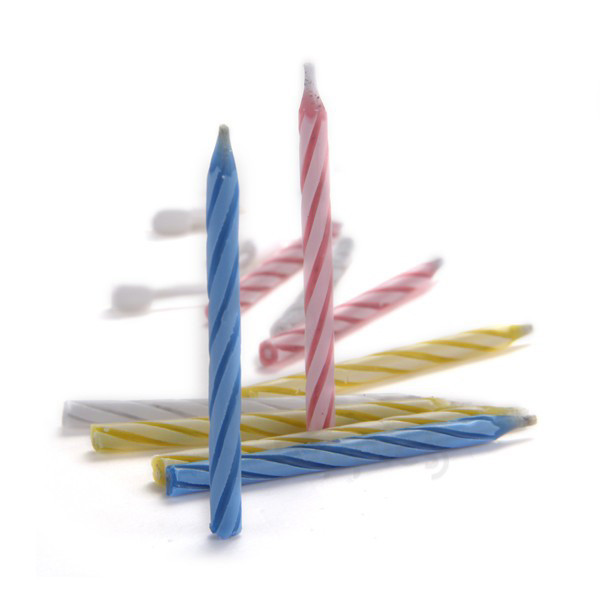 Kék, piros, sárga, zöld színű újragyulladó varázsgyertyák tartóval.
