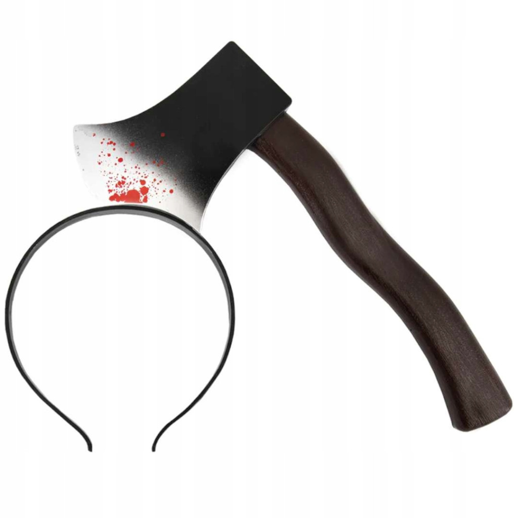 Fekete és szürke műanyag, piros festékkel véres hatásúra festett balta hajpántra rögzítve. A jelmez kiegészítőt a fejre téve olyan látszatot kelt mintha a balta bele állt volna  fejbe.