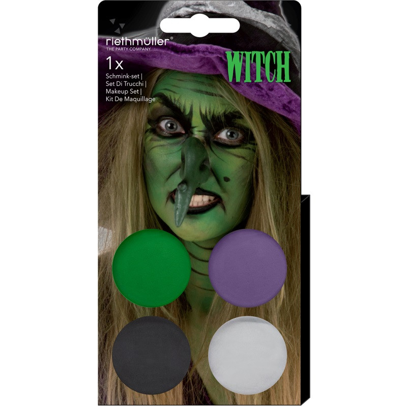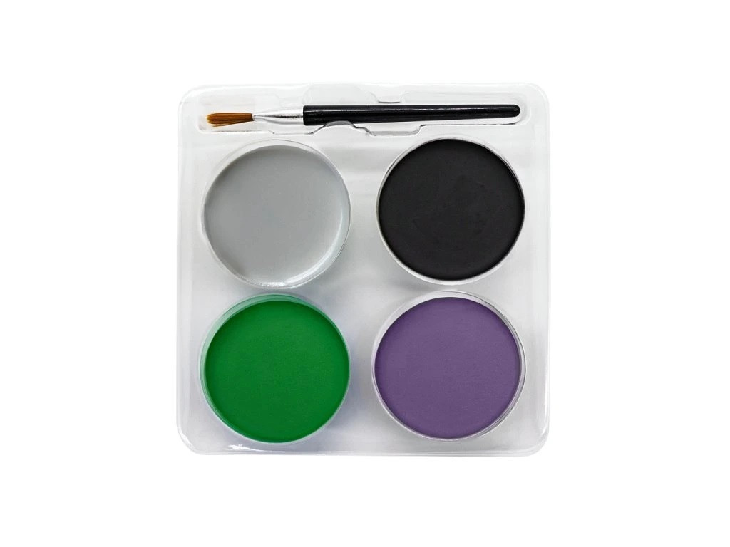 Boszorkány smink szett. Tartalmaz ezüst, fekete, zöld és lila színeket és 1 db ecsetet.
